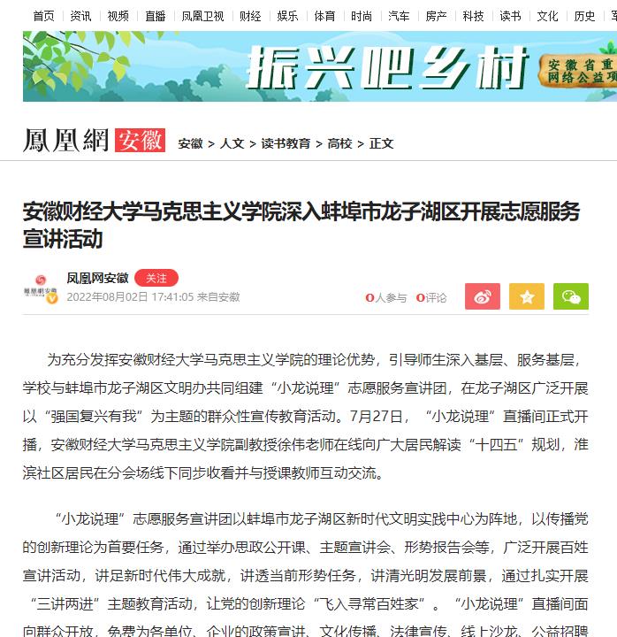 8月2日,凤凰网、安徽新闻网以《乐竞在线注册马克思主义学院深入蚌埠市龙子湖区开展志愿服务宣讲活动》为题,报道我校充分发挥马克思主义学院的理论优势,引导师生深入基层、服务基层,在实践中积极促进理论学习的教学转化。
