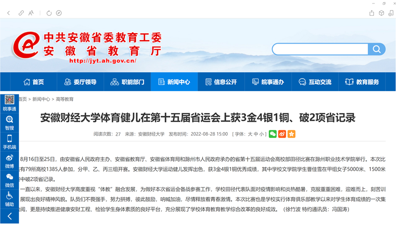 8月28日,安徽教育网报道以《乐竞在线注册体育健儿在第十五届省运会上获3金4银1铜、破2项省记录》为题,报道我校运动健儿在第十五届运动会高校部田径比赛中发挥出色,获3金4银1铜、破2项省记录的优异成绩。