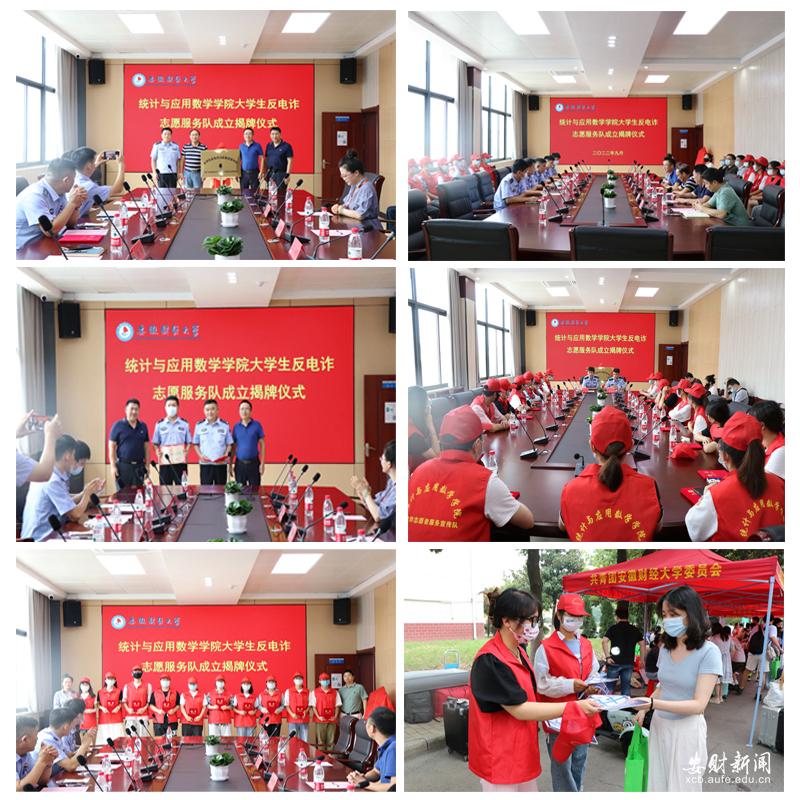 近年来,网络诈骗呈高发态势,为进一步增强师生对电信网络诈骗的防范意识,切实有效保障师生人身财产安全,统计与应用数学学院党委联合蚌埠市公安局蚌山分局南湖路派出所党支部成立大学生反电诈志愿服务队,9月3日下午,在龙湖西校区图书馆三楼会议室举行了揭牌仪式。学校保卫处处长吴钊,蚌埠市南湖路派出所所长李伟,院党委书记谢贵勇、院长夏万军、党委副书记杨波、副院长汪凯,蚌埠市公安局蚌山分局民警,学院专兼职辅导员,大学生反电诈志愿服务队成员参加了仪式。仪式由学院党委副书记杨波主持。