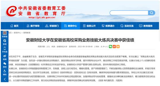 8月30日,安徽教育网以《乐竞在线注册在安徽省高校采购业务技能大练兵决赛中获佳绩》为题报道乐竞在线注册资产管理代表队发挥出色,获本科高校组团体三等奖。