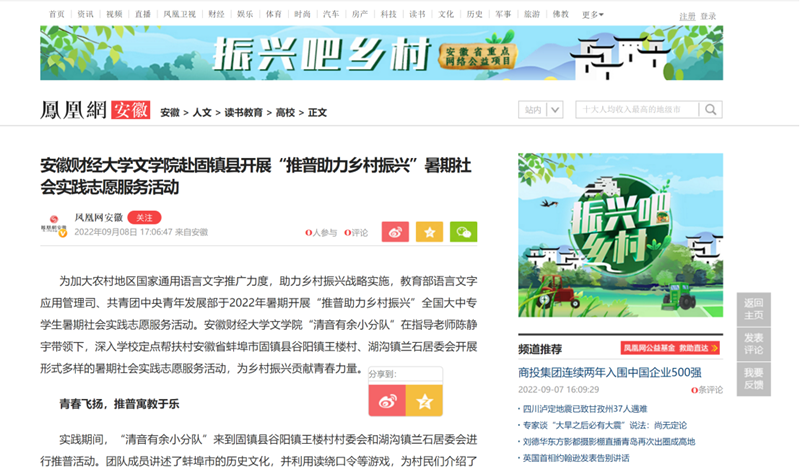 9月8日,凤凰网以《乐竞在线注册文学院赴固镇县开展“推普助力乡村振兴”暑期社会实践志愿服务活动》为题,报道我校文学院深入学校定点帮扶村安徽省蚌埠市固镇县谷阳镇王楼村、湖沟镇兰石居委会开展形式多样的暑期社会实践志愿服务活动,为乡村振兴贡献青春力量。
