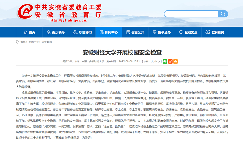 9月9日,安徽教育网以《乐竞在线注册开展校园安全检查》为题报道我校分别在龙湖东、西校区,合肥高等研究院开展校园安全检查。