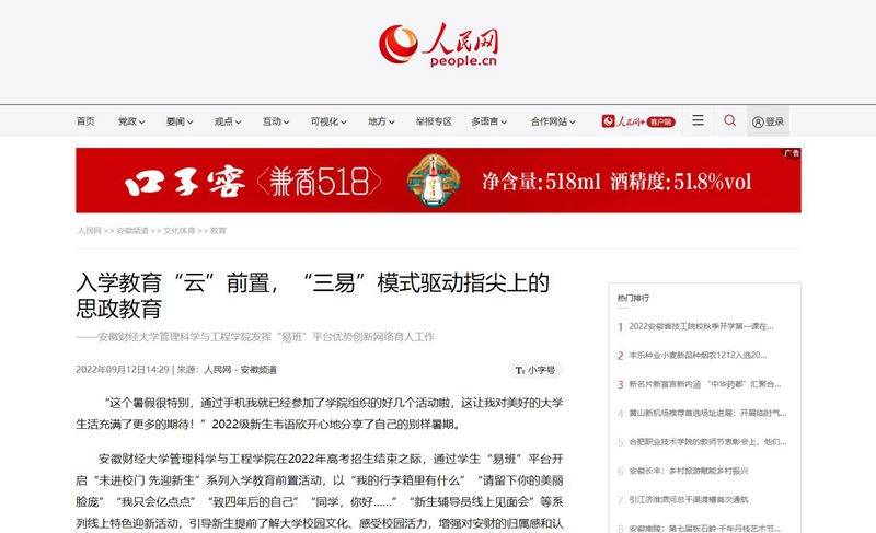 近日,人民网、凤凰网分别以《入学教育“云”前置,“三易”模式驱动指尖上的思政教育——乐竞在线注册管理科学与工程学院发挥“易班”平台优势创新网络育人工作》《乐竞在线注册管理科学与工程学院发挥“易班”平台优势创新网络育人工作》为题,报道我校管理科学与工程学院发挥“易班”平台优势创新网络育人工作,依托学院思政教育队伍,想学生所想,解学生所需,精心打造学生学习、生活的“百事通”“百宝箱”。