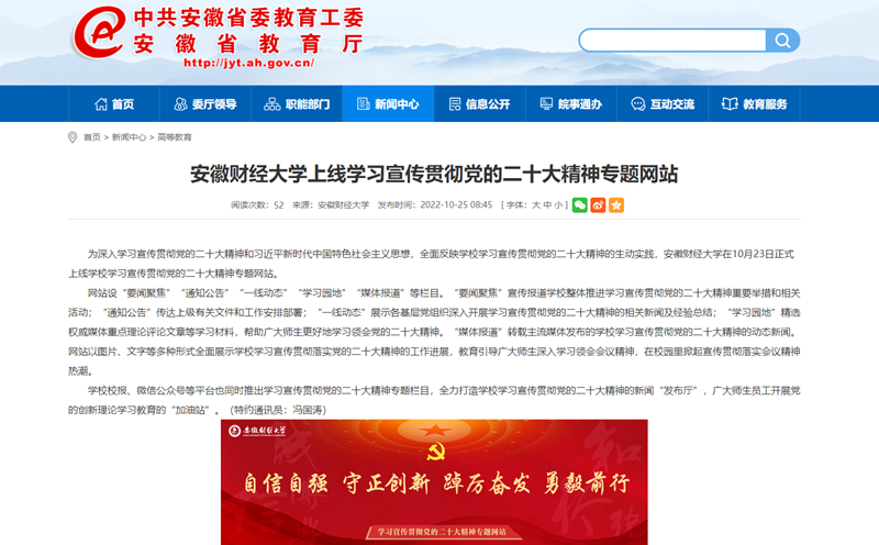 10月25日,安徽教育网、凤凰网以《乐竞在线注册上线学习宣传贯彻党的二十大精神专题网站》为题,报道我校学习宣传贯彻党的二十大精神专题网站正式上线。