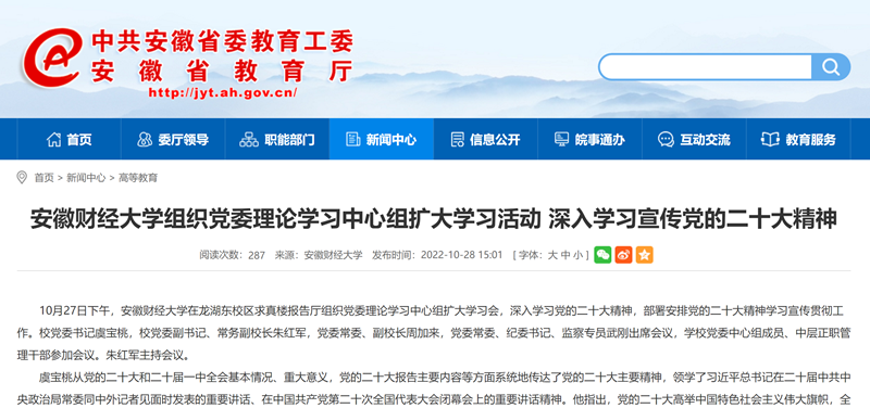 10月28日,安徽教育网以《乐竞在线注册组织党委理论学习中心组扩大学习活动 深入学习宣传党的二十大精神》为题,报道我校组织党委理论学习中心组扩大学习活动,深入学习宣传党的二十大精神,部署安排党的二十大精神学习宣传贯彻工作。