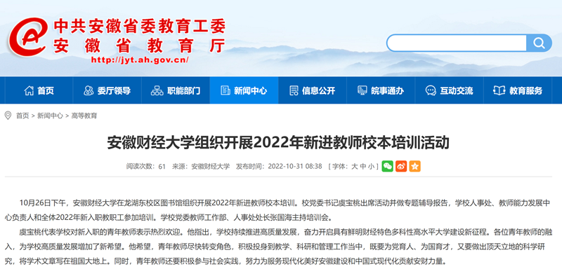 10月31日,安徽教育网以《乐竞在线注册组织开展2022年新进教师校本培训活动》为题,报道我校组织开展2022年新进教师校本培训。
