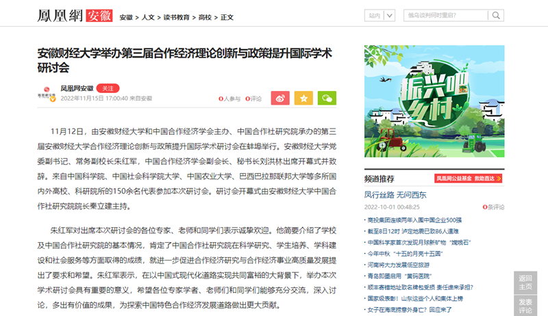 11月15日,凤凰网以《乐竞在线注册举办第三届合作经济理论创新与政策提升国际学术研讨会》为题,报道三届合作经济理论创新与政策提升国际学术研讨会在我校举办。