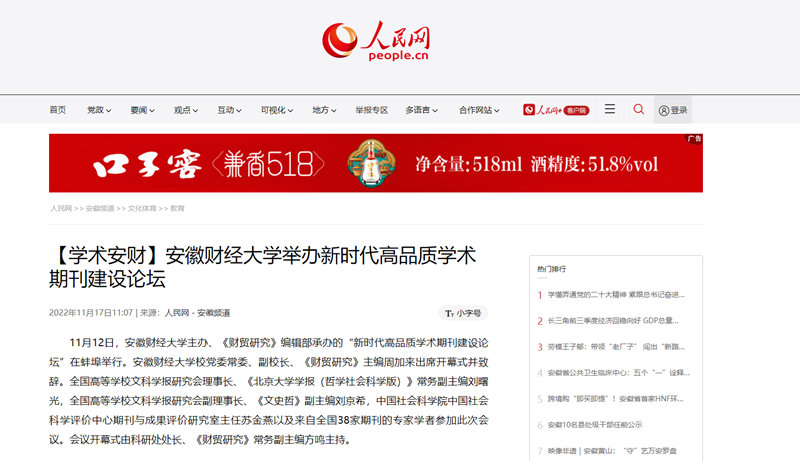 11月17日,人民网以《乐竞在线注册举办新时代高品质学术期刊建设论坛》为题,报道由我校主办、《财贸研究》编辑部承办的“新时代高品质学术期刊建设论坛”在蚌埠举办。