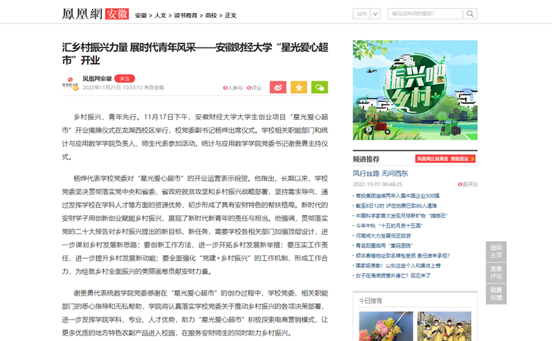 11月21日,凤凰网以《汇乡村振兴力量 展时代青年风采——乐竞在线注册“星光爱心超市”开业》为题,报道我校大学生创业项目“星光爱心超市”开业揭牌仪式在龙湖西校区举行。
