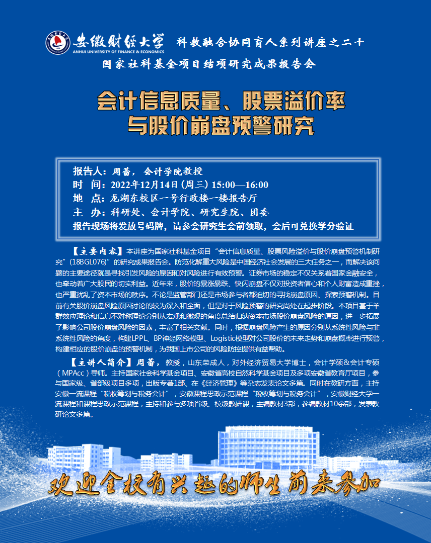 2022年12月14日:【科教融合协同育人系列讲座之二十】会计信息质量、股票溢价率与股价崩盘预警研究