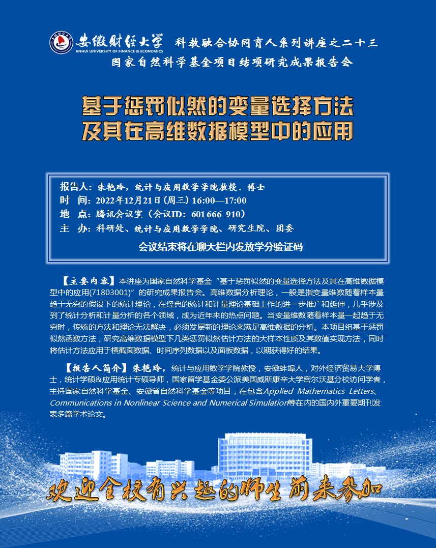 2022年12月21日:【科教融合协同育人系列讲座之二十三】基于惩罚似然的变量选择方法及其在高维数据模型中的应用