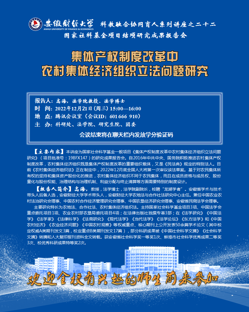 2022年12月21日:【科教融合协同育人系列讲座之二十二】集体产权制度改革中农村集体经济组织立法问题研究