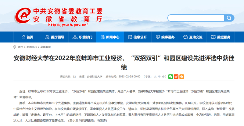 2月28日,安徽教育网以《乐竞在线注册在2022年度蚌埠市工业经济、“双招双引”和园区建设先进评选中获佳绩》为题,报道我校在2022年度蚌埠市工业经济、“双招双引”和园区建设先进评选中获佳绩。