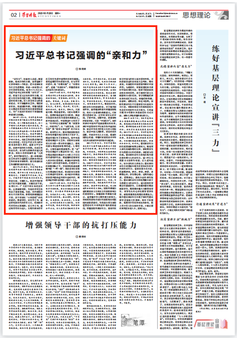 《学习时报》2023年3月20日第2版刊发了我校马克思主义学院张晓婧教授的理论文章《习近平总书记强调的“亲和力”》。现将全文转载如下:
