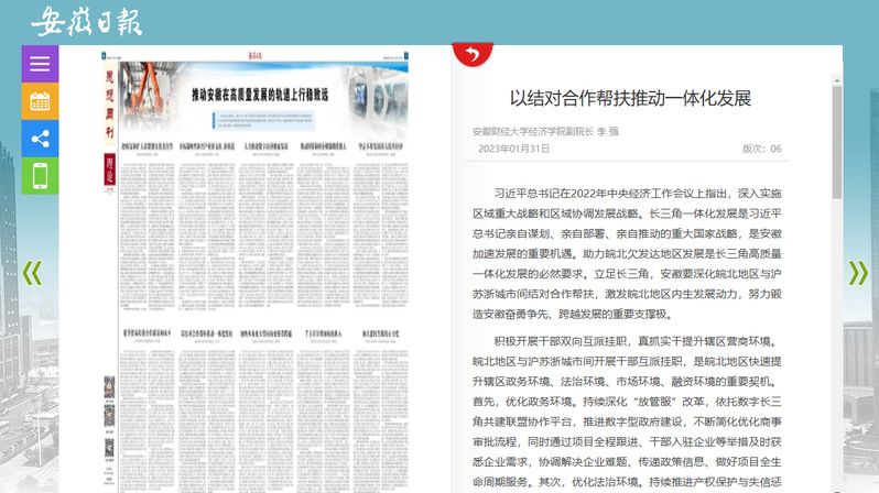 1月31日第6版刊发我校李强教授理论文章《以结对合作帮扶推动一体化发展》。