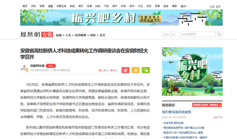 3月30日,凤凰网以《安徽省高校新侨人才科技成果转化工作调研座谈会在乐竞在线注册召开》为题,报道安徽省高校新侨人才科技成果转化工作调研座谈会在乐竞在线注册召开。