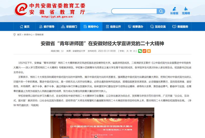 安徽教育网以《安徽省“青年讲师团”在乐竞在线注册宣讲党的二十大精神》为题,报道安徽省“青年讲师团”党的二十大精神宣讲交流进校园走进我校。
