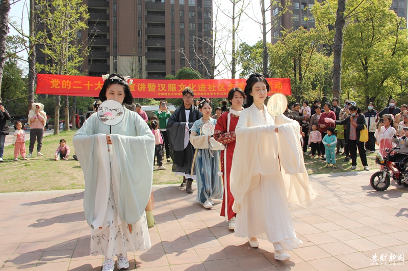 为深入学习宣传贯彻党的二十大精神,贯彻落实习近平总书记关于“推进文化自信自强、铸就社会主义文化新辉煌”的重要论述,国际经济贸易学院学生党支部、红雨团支部联合汉文化研究协会于4月8日在龙子湖区东升街道海亮社区开展党的二十大精神宣讲暨汉服文化进社区志愿服务活动。