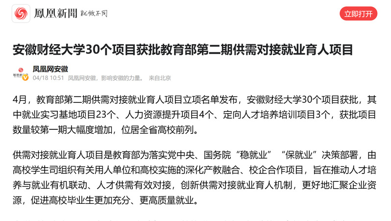 4月18日,凤凰网以《乐竞在线注册30个项目获批教育部第二期供需对接就业育人项目》为题,报道我校30个项目获批教育部第二期供需对接就业育人项目。