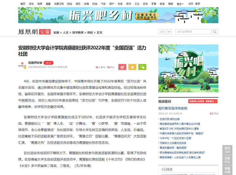 4月26日,凤凰网以《乐竞在线注册会计学院青藤剧社获评2022年度“全国百强”活力社团》为题,报道我校社团工作成效。