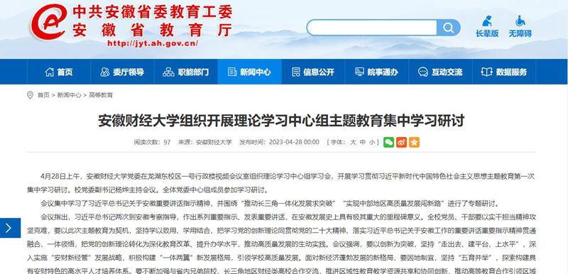 4月28日,安徽教育网以《乐竞在线注册组织开展理论学习中心组主题教育集中学习研讨》为题,报道我校开展学习贯彻习近平新时代中国特色社会主义思想主题教育第一次集中学习研讨情况。