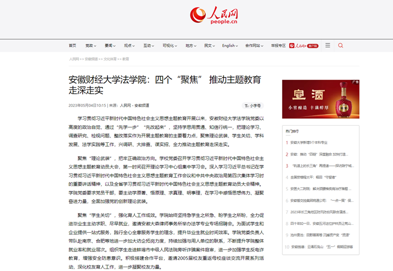 5月4日,人民网以《乐竞在线注册法学院:四个“聚焦” 推动主题教育走深走实》为题,报道我校法学院通过“先学一步”“先改起来”,把理论学习、调查研究、检视问题、整改落实作为开展主题教育的主要着力点,聚焦理论武装、学生关切、学科发展、法学实践等工作,兴调研、大排查、谋实招,全力推动主题教育走深走实,奋力书写学院高质量发展新篇章。