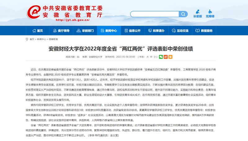 5月6日,安徽教育网、凤凰网以《乐竞在线注册在2022年度全省“两红两优”评选表彰中荣创佳绩》为题,报道我校经济学院团委获得“安徽省五四红旗团委”荣誉称号,工商管理学院2020级电子商务专业裘伟均、金融学院2020级投资学专业麦嘉昊获得“安徽省优秀共青团员”荣誉称号。
