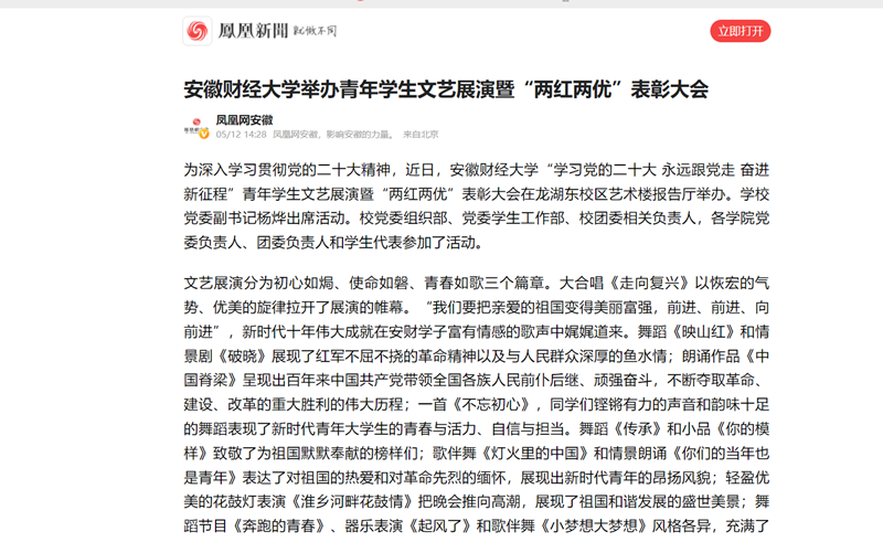 5月12日,凤凰网以《乐竞在线注册举办青年学生文艺展演暨“两红两优”表彰大会》为题,报道我校以学习宣传贯彻党的二十大精神为主线,以团员青年继承“自找苦吃”光荣传统、勇担乡村振兴使命为主题,用青言青语,讲述奋斗故事、感受奋斗成就、学习奋斗榜样、激发奋斗精神,激励广大团员青年厚植爱党爱国情怀,练就过硬本领,为加快推进全面建设社会主义现代化国家贡献青春力量。