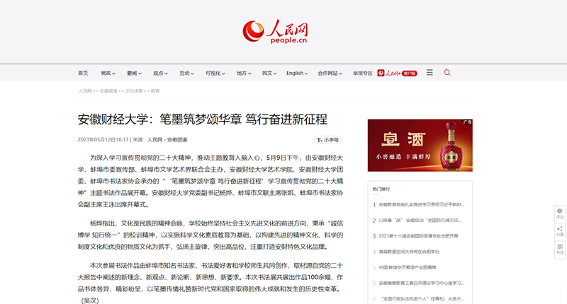5月12日,人民网以《乐竞在线注册:笔墨筑梦颂华章 笃行奋进新征程》为题,报道我校为深入学习宣传贯彻党的二十大精神,推动主题教育入脑入心,5月9日“‘笔墨筑梦颂华章 笃行奋进新征程’学习宣传贯彻党的二十大精神” 主题书法作品展开幕。本次参展的百余幅书法作品是由蚌埠市知名书法家、书法爱好者和我校师生共同创作,取材源自党的二十大报告中阐述的新理念、新观点、新论断、新思想、新要求,以笔墨传情礼赞新时代党和国家取得的伟大成就和发生的历史性变革。