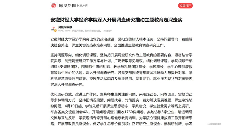 5月17日,凤凰网以《乐竞在线注册经济学院深入开展调查研究推动主题教育走深走实》为题,报道我校经济学院紧扣立德树人根本任务,坚持问题导向,着眼解决社会关注、师生关切的热点难点问题,全面深入推进主题教育调查研究工作,以学促干、踔厉奋发,切实把调查研究成果转化为推进人才培养的实际成效。