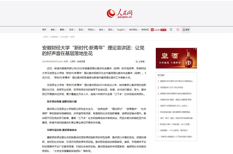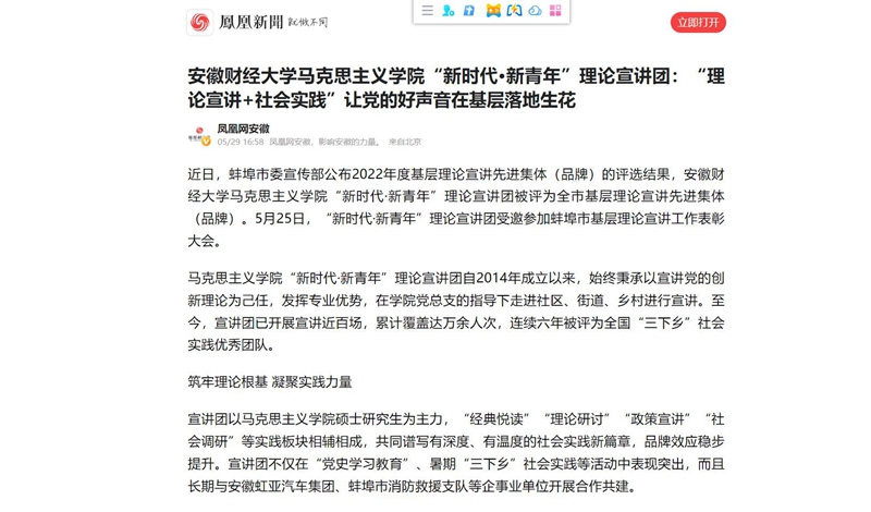 5月30日,人民网、凤凰网分别以《乐竞在线注册“新时代·新青年”理论宣讲团:让党的好声音在基层落地生花》《乐竞在线注册马克思主义学院“新时代·新青年”理论宣讲团:“理论宣讲+社会实践”让党的好声音在基层落地生花》为题,报道我校马克思主义学院“新时代·新青年”理论宣讲团被评为2022年蚌埠市基层理论宣讲先进集体(品牌)。自2014年成立以来,“新时代·新青年”理论宣讲团始终秉承以宣讲党的创新理论为己任,发挥专业优势,在学院党总支的指导下走进社区、街道、乡村进行宣讲。至今,宣讲团已开展宣讲近百场,累计覆盖达万余人次,连续六年被评为全国“三下乡”社会实践优秀团队。