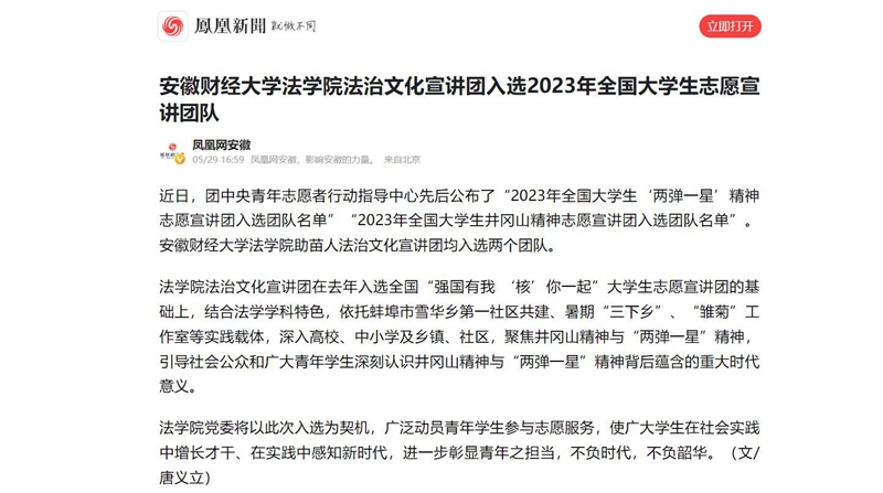 5月29日,凤凰网以《乐竞在线注册法学院法治文化宣讲团入选2023年全国大学生志愿宣讲团队》为题,报道我校法学院助苗人法治文化宣讲团入选“2023年全国大学生‘两弹一星’精神志愿宣讲团入选团队名单”“2023年全国大学生井冈山精神志愿宣讲团入选团队名单”。法学院党委将以此次入选为契机,广泛动员青年学生参与志愿服务,使广大学生在社会实践中增长才干、在实践中感知新时代,进一步彰显青年之担当,不负时代,不负韶华。