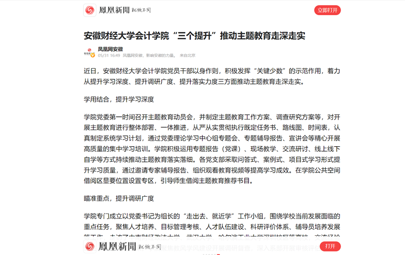 5月31日,凤凰网以《乐竞在线注册会计学院“三个提升”推动主题教育走深走实》为题,报道我校会计学院党员干部以身作则,积极发挥“关键少数”的示范作用,着力从提升学习深度、提升调研广度、提升落实力度三方面推动主题教育走深走实、见行见效,切实以主题教育新成效推动学院事业再上新台阶。