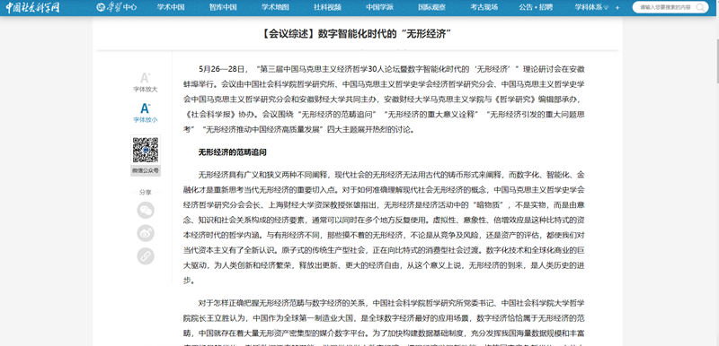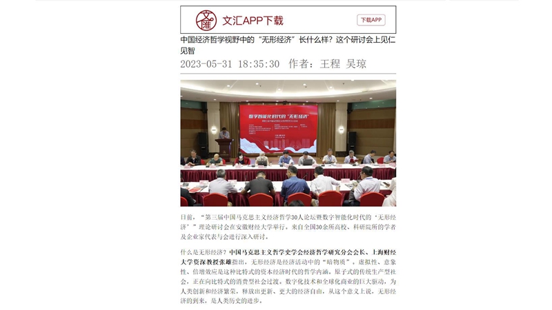 近日,中国社会科学网、文汇分别以《数字智能化时代的“无形经济”》《中国经济哲学视野中的“无形经济”长什么样?这个研讨会上见仁见智》为题,报道了第三届中国马克思主义经济哲学30人论坛暨数字智能化时代的“无形经济”理论研讨会在我校举办。