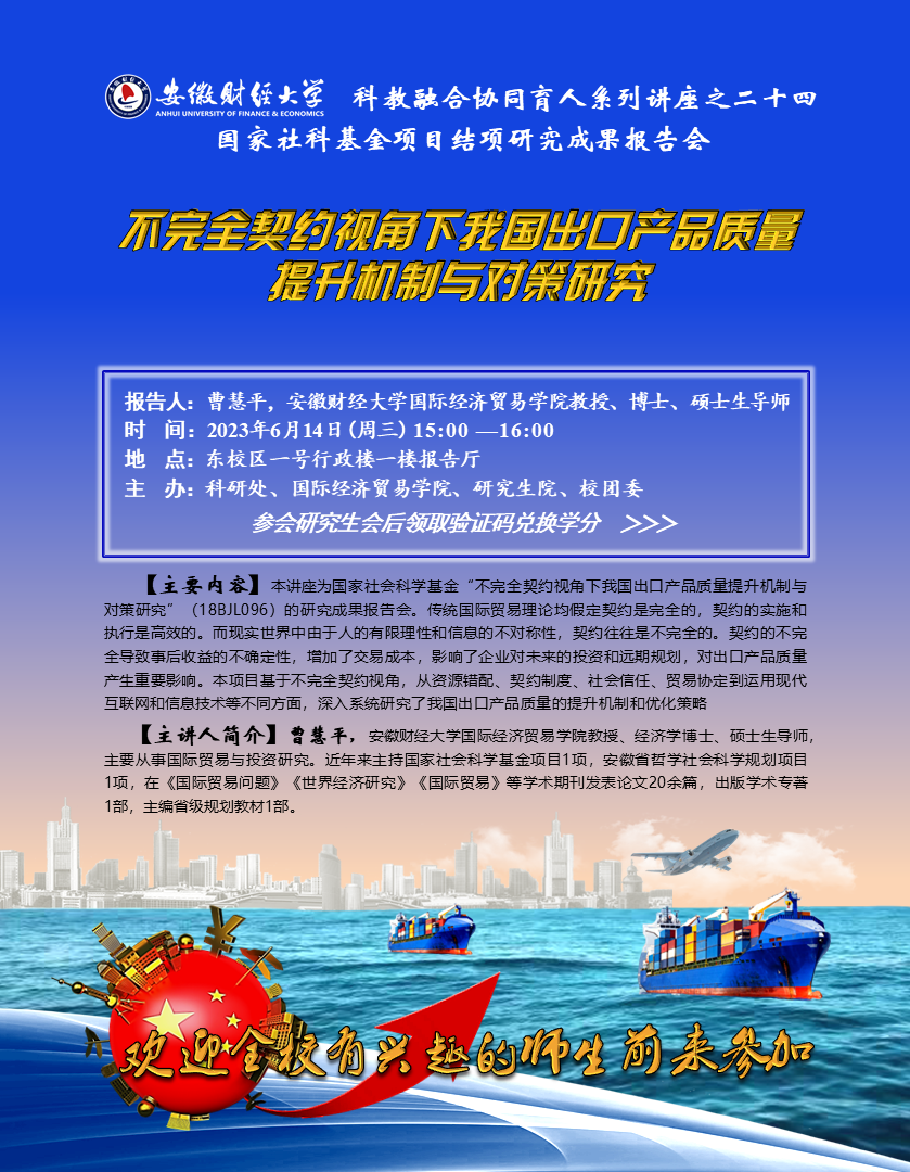 2023年6月14日:【科教融合协同育人系列讲座之二十四】不完全契约视角下我国出口产品质量提升机制与对策研究