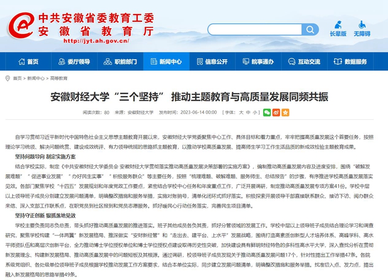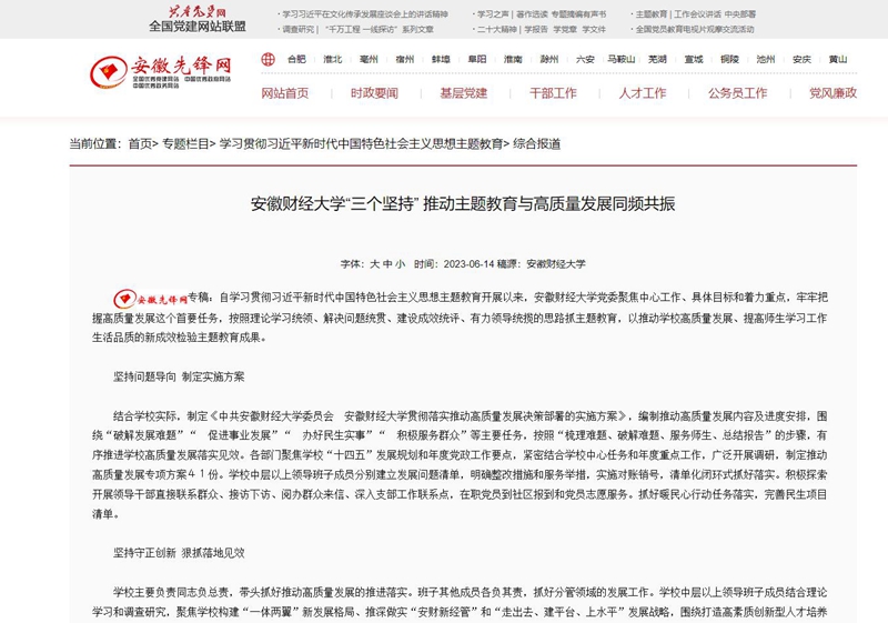 6月14日,安徽先锋网、安徽教育网以《乐竞在线注册“三个坚持” 推动主题教育与高质量发展同频共振》为题,报道我校自学习贯彻习近平新时代中国特色社会主义思想主题教育开展以来,学校党委聚焦中心工作、具体目标和着力重点,牢牢把握高质量发展这个首要任务,按照理论学习统领、解决问题统贯、建设成效统评、有力领导统揽的思路抓主题教育,以推动学校高质量发展、提高师生学习工作生活品质的新成效检验主题教育成果。