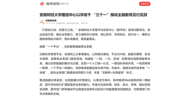 6月16日,凤凰网以《乐竞在线注册图信中心以学促干 “三个一”推动主题教育见行见效》为题,报道我校图书与信息中心(图书馆)坚持问题导向,突出实践引领,强化业务能力,努力做到学以致用、用以促学、学用相长、知行合一,确保主题教育高起点展开、高标准推进、高质量落实。