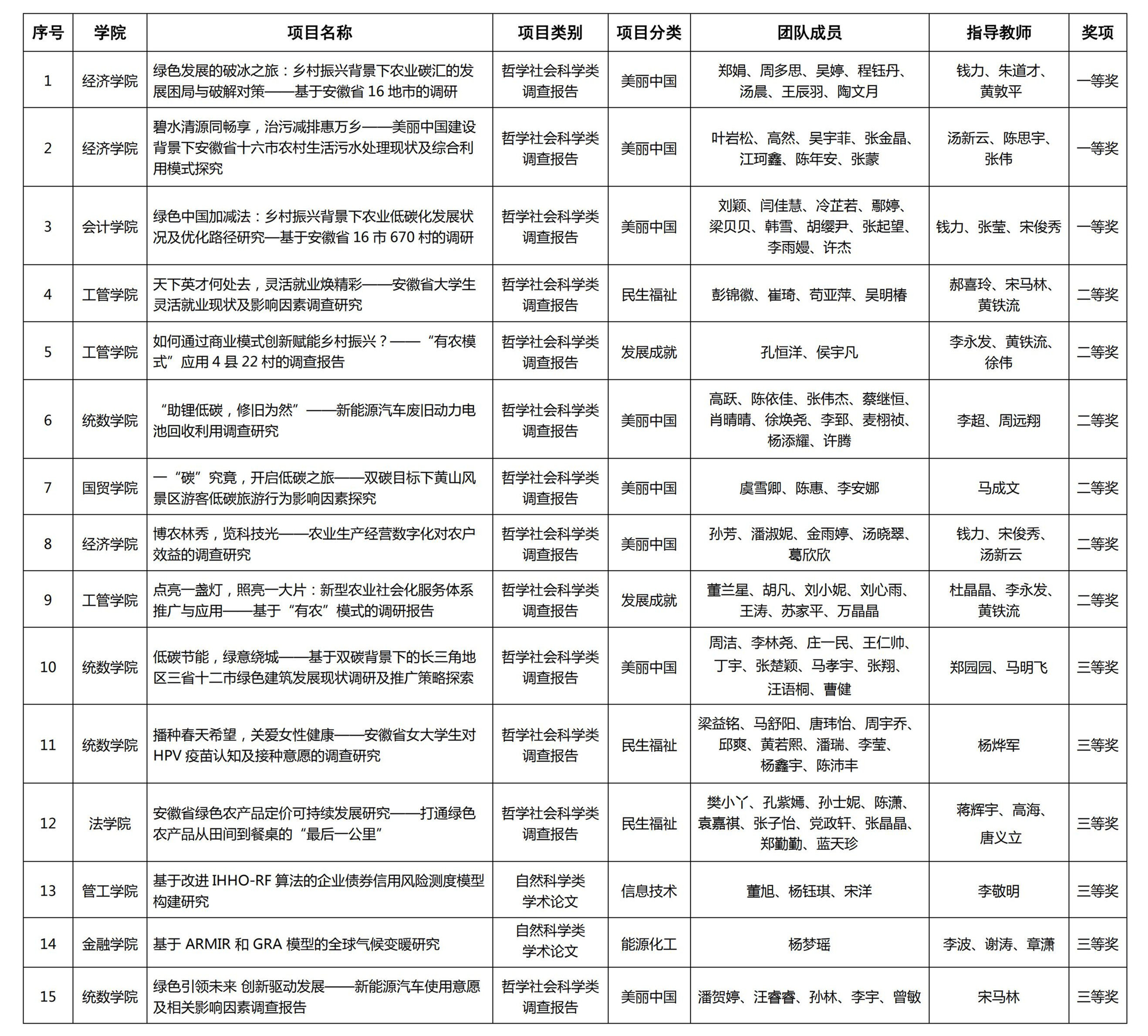 本届“挑战杯”组织工作自2023年3月启动,各学院积极申报,共有588件作品、2766名同学参加校内选拔赛。经校级、省级比赛中的多个评审环节,最终我校15件作品获得省级奖项。其中,经济学院作品《绿色发展的破冰之旅:乡村振兴背景下农业碳汇的发展困局与破解对策——基于安徽省16地市的调研》、会计学院作品《绿色中国加减法:乡村振兴背景下农业低碳化发展状况及优化路径研究—基于安徽省16市670村的调研》、经济学院作品《碧水清源同畅享,治污减排惠万乡——美丽中国建设背景下安徽省十六市农村生活污水处理现状及综合利用模式探究》获省赛一等奖;工管学院作品《天下英才何处去,灵活就业焕精彩——安徽省大学生灵活就业现状及影响因素调查研究》、统数学院作品《“助锂低碳,修旧为然”——新能源汽车废旧动力电池回收利用调查研究》、工管学院作品《如何通过商业模式创新赋能乡村振兴?——“有农模式”应用4县22村的调查报告》、国贸学院作品《一“碳”究竟,开启低碳之旅——双碳目标下黄山风景区游客低碳旅游行为影响因素探究》、经济学院作品《博农林秀,览科技光——农业生产经营数字化对农户效益的调查研究》、工管学院作品《点亮一盏灯,照亮一大片:新型农业社会化服务体系推广与应用——基于“有农”模式的调研报告》获省赛二等奖;统数学院作品《播种春天希望,关爱女性健康——安徽省女大学生对HPV疫苗认知及接种意愿的调查研究》、法学院作品《安徽省绿色农产品定价可持续发展研究——打通绿色农产品从田间到餐桌的“最后一公里”》、统数学院作品《低碳节能,绿意绕城——基于双碳背景下的长三角地区三省十二市绿色建筑发展现状调研及推广策略探索》、管工学院作品《基于改进IHHO-RF算法的企业债券信用风险测度模型构建研究》、金融学院作品《基于 ARMIR 和 GRA 模型的全球气候变暖研究》、统数学院作品《绿色引领未来 创新驱动发展——新能源汽车使用意愿及相关影响因素调查报告》获省赛三等奖。