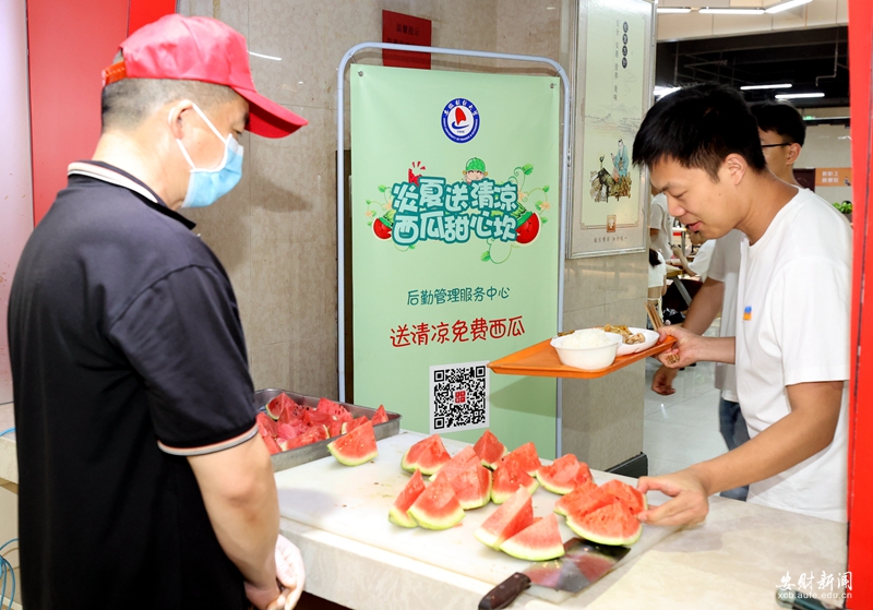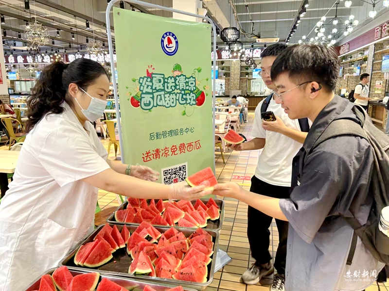 6月29日中午,在龙湖东校区两个自营餐厅和龙湖西校区常奥餐厅,后勤工作人员将切好的西瓜整齐摆放在领取台,每位师生均可免费领取。骄阳似火的天气,最适宜吃西瓜消暑。吃着甘甜可口的西瓜,同学们脸上纷纷洋溢出了喜悦的笑容。据后勤工作人员介绍,此次“送瓜”活动会持续开展,全校师生共当“吃瓜群众”,实实在在为瓜农解决了难题。