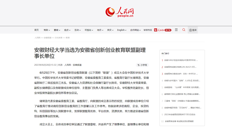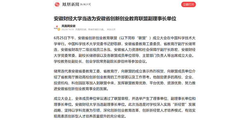 6月28日,人民网、凤凰网以《乐竞在线注册当选为安徽省创新创业教育联盟副理事长单位》为题,报道在6月25日召开的安徽省创新创业教育联盟成立大会上,我校当选副理事长单位。