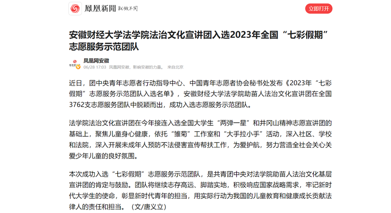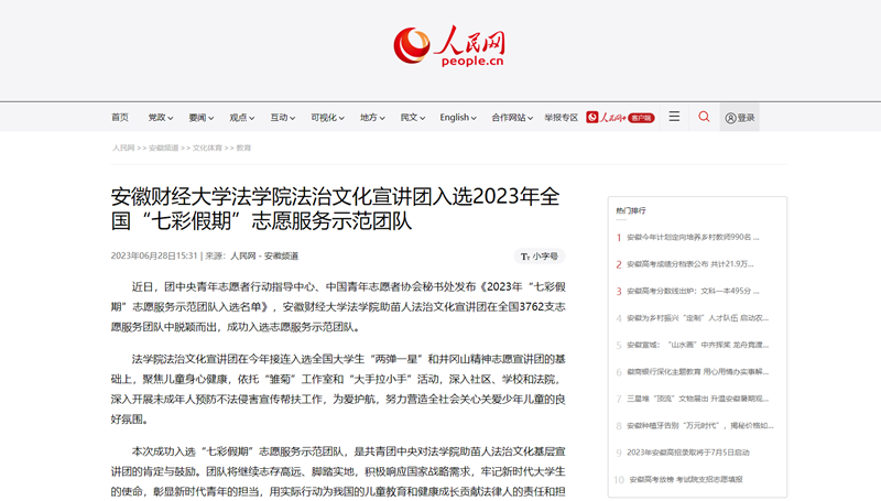 6月28日,人民网、凤凰网以《乐竞在线注册法学院法治文化宣讲团入选2023年全国“七彩假期”志愿服务示范团队》为题,报道我校法学院助苗人法治文化宣讲团在全国3762支志愿服务团队中脱颖而出,成功入选志愿服务示范团队。