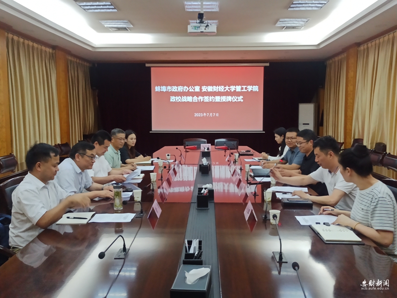为加强政校合作,促进政校相关领域工作高质量发展,深化协同育人模式走深走实,7月7日,管理科学与工程学院党委副书记刘朝新带队赴蚌埠市人民政府办公室交流并进行共建“大学生信息能力提升实践教育基地”签约暨授牌仪式。蚌埠市政府副秘书长蓝佳勇、办公室副主任梅友伟,蚌埠市政府办公室相关科室负责人以及管工学院相关负责人参加会议。