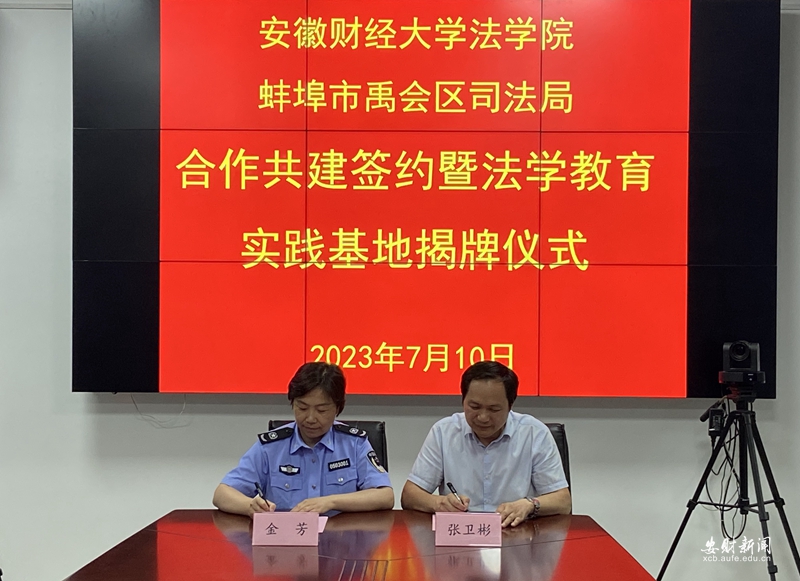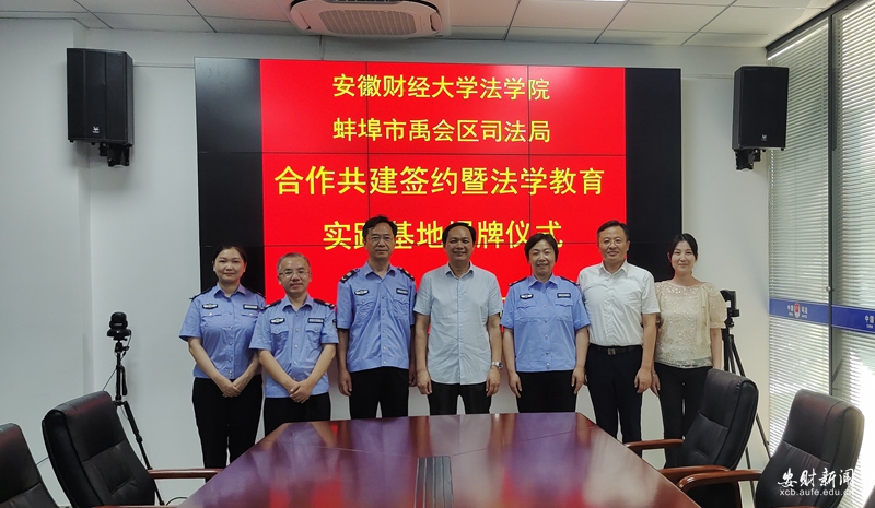 7月10日下午,法学院与蚌埠市禹会区司法局合作共建签约暨法学教育实践基地揭牌仪式在禹会区司法局举行。法学院党委书记张卫彬、副书记舒立,禹会区司法局党组书记、局长金芳,副局长朱德金、邹德年、王雨婷等参加仪式。