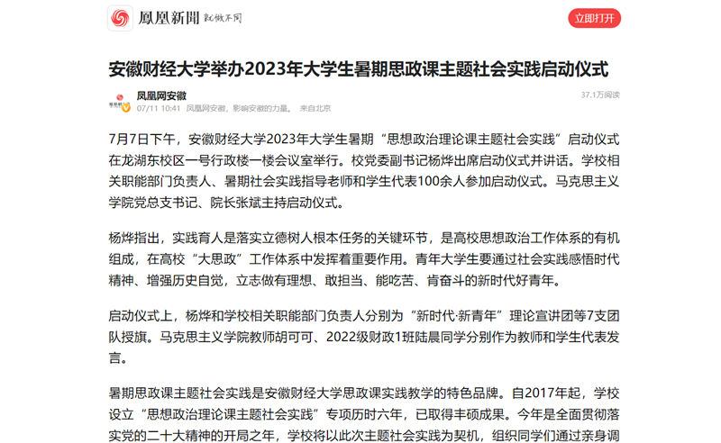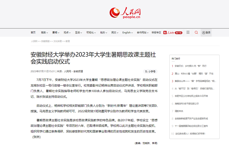 7月11日,人民网、凤凰网以《乐竞在线注册举办2023年大学生暑期思政课主题社会实践启动仪式》为题,报道我校于7月7日正式启动2023年大学生暑期思想政治理论课主题社会实践。暑期思政课主题社会实践是我校思政课实践教学的特色品牌,已历时六年取得丰硕成果。