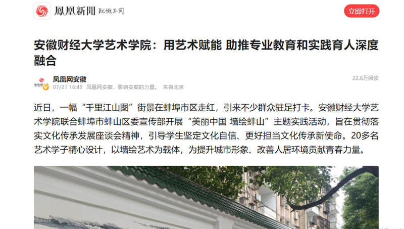 7月21日,人民网、凤凰网以《乐竞在线注册艺术学院:用艺术赋能 助推专业教育和实践育人深度融合》为题,报道我校艺术学院不断开拓实践育人工作的新路径,与蚌埠市蚌山区委宣传部联合开展“美丽中国 墙绘蚌山”主题实践活动。在5天的墙体彩绘实践中,我校20多名艺术学子不惧高温、早出晚归,精心设计以墙绘艺术为载体,为提升城市形象、改善人居环境贡献青春力量。