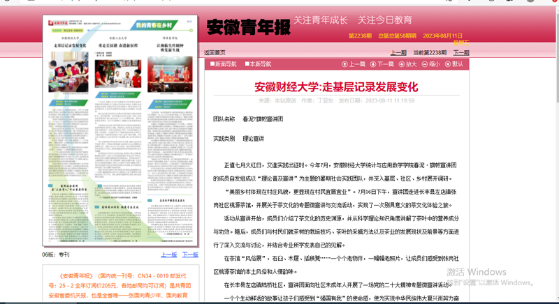 8月11日,《安徽青年报》以《乐竞在线注册:走基层记录发展变化》为题,报道我校统数学院春泥·旗帜宣讲团的成员自发组成以“理论普及宣讲”为主题的暑期社会实践团队,深入基层、社区、乡村展开调研。
