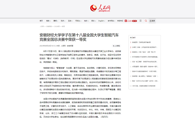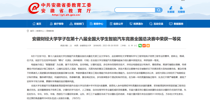 8月28日,人民网、安徽教育网以《乐竞在线注册学子在第十八届全国大学生智能汽车竞赛全国总决赛中荣获一等奖》为题,报道在刚刚结束的第十八届全国大学生智能汽车竞赛全国总决赛上,我校管理科学与工程学院电子信息工程专业的曹祥、陈新云、韩阔、位子龙、祝亚宁五位同学组成的“曙光”代表队(指导教师:付明)在全国大学生智能汽车竞赛电能接力组比赛中表现突出,荣获国家一等奖。