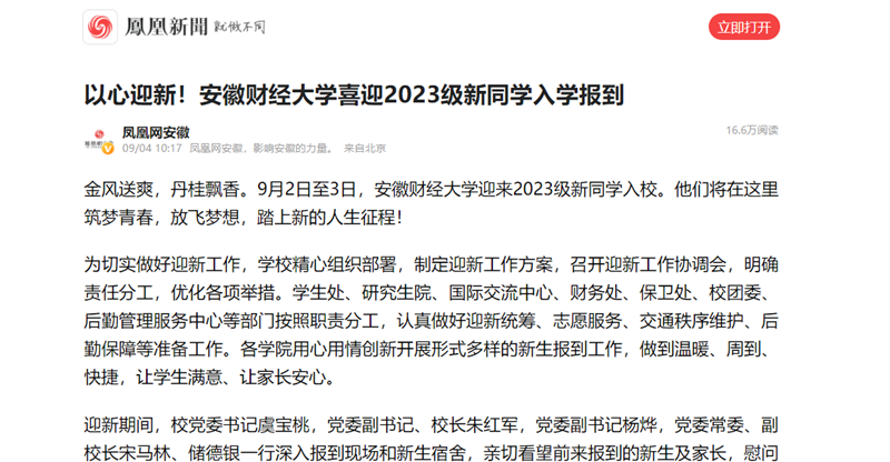 9月4日,人民网、凤凰网以《乐竞在线注册喜迎2023级新同学入学报到》为题,报道我校为切实做好迎新工作,精心组织部署,制定迎新工作方案,召开迎新工作协调会,明确责任分工,优化各项举措,确保让学生满意、让家长安心。