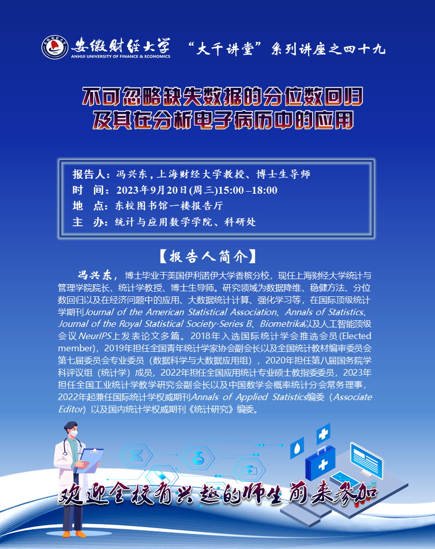 2023年9月20日:【“大千讲堂”系列讲座之四十九】不可忽略缺失数据的分位数回归及其在分析电子病历中的应用