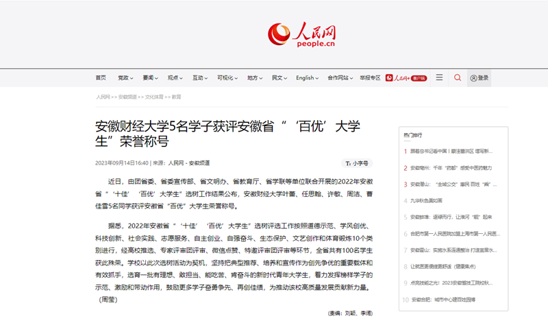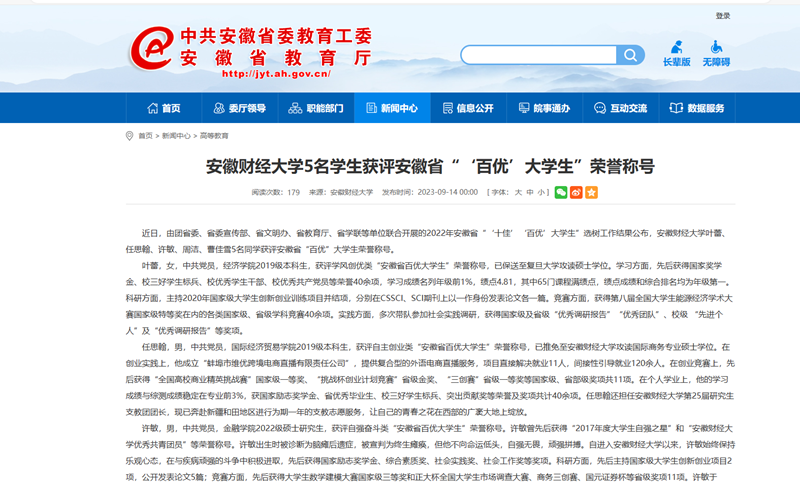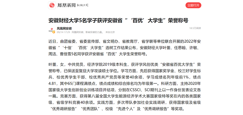 9月14日,人民网、安徽教育网、凤凰网以《乐竞在线注册5名学子获评安徽省“‘百优’大学生”荣誉称号》为题,报道我校叶蕾、任思翰、许敏、周洁、曹佳雪5名同学获评安徽省“百优”大学生荣誉称号。